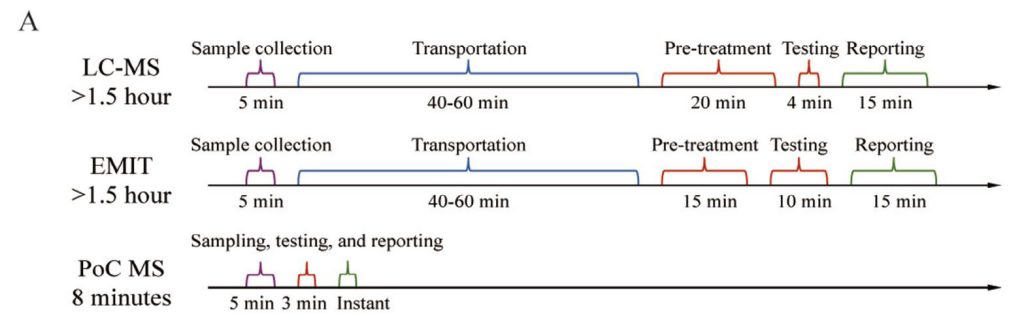 between whole blood and serum concentrations (R2=0.978). PoC MS measurements of VPA closely matched LC–MS (r=0.990, bias=0.16%) and EMIT (r=0.988, bias=5.4%). In clinic, VPA level varied by up to 15-fold across patients, and bedside PoC MS could depict dynamic VPA concentration profiles, with intra-patient fluctuations averaging 26%, thereby supporting drug monitoring and therapeutic decision-making.